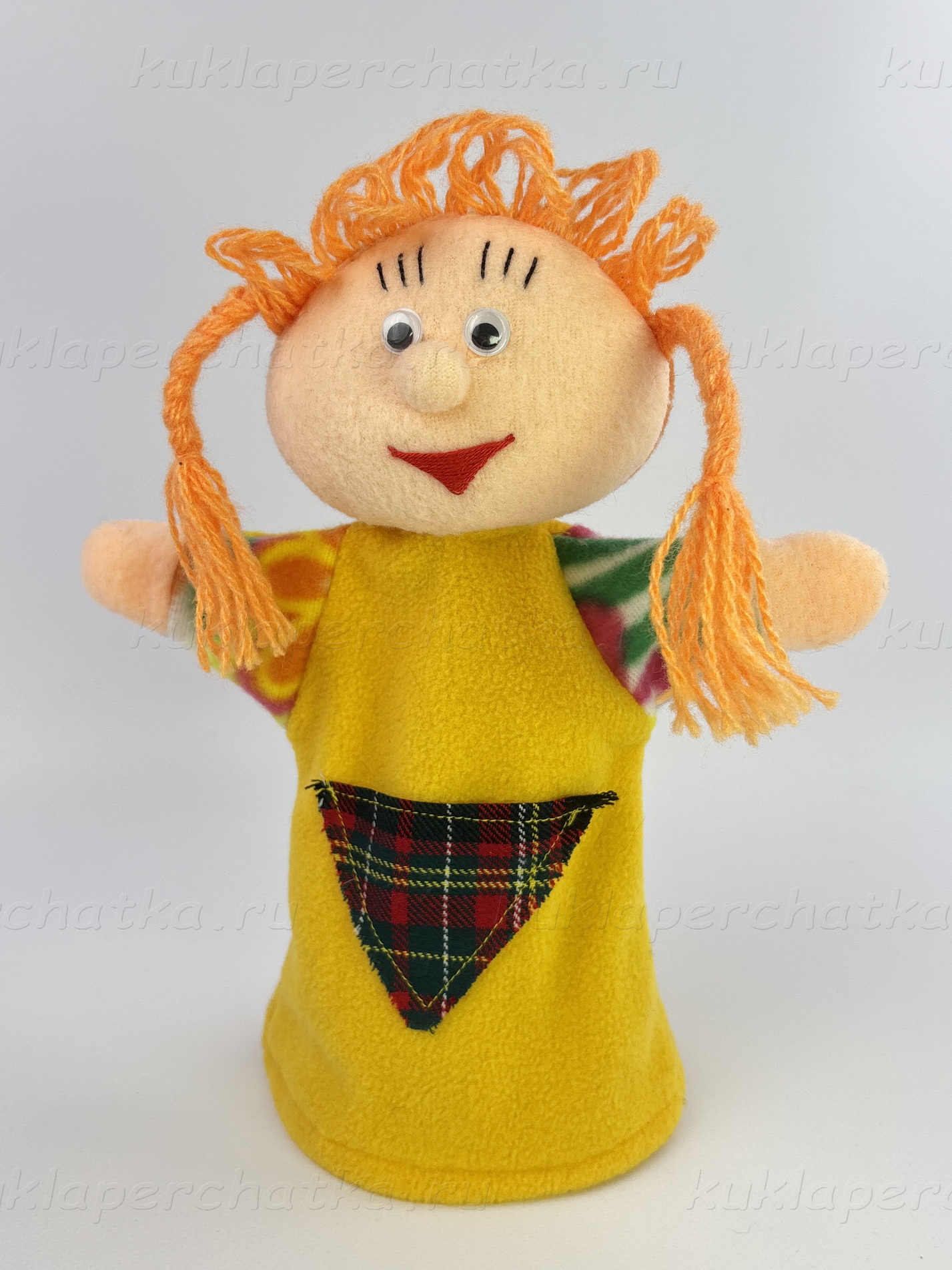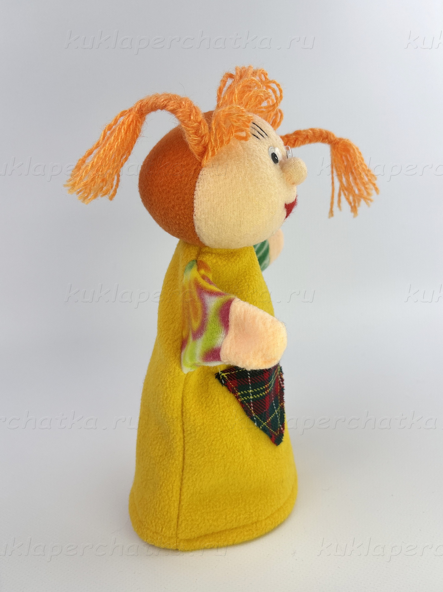 Пожалуйста, учитывайте, что так как все перчаточные куклы выполнены вручную, отправленная Вам кукла-перчатка может отличаться от представленной на фото цветом одежды, размером глаз, выражением лица.
