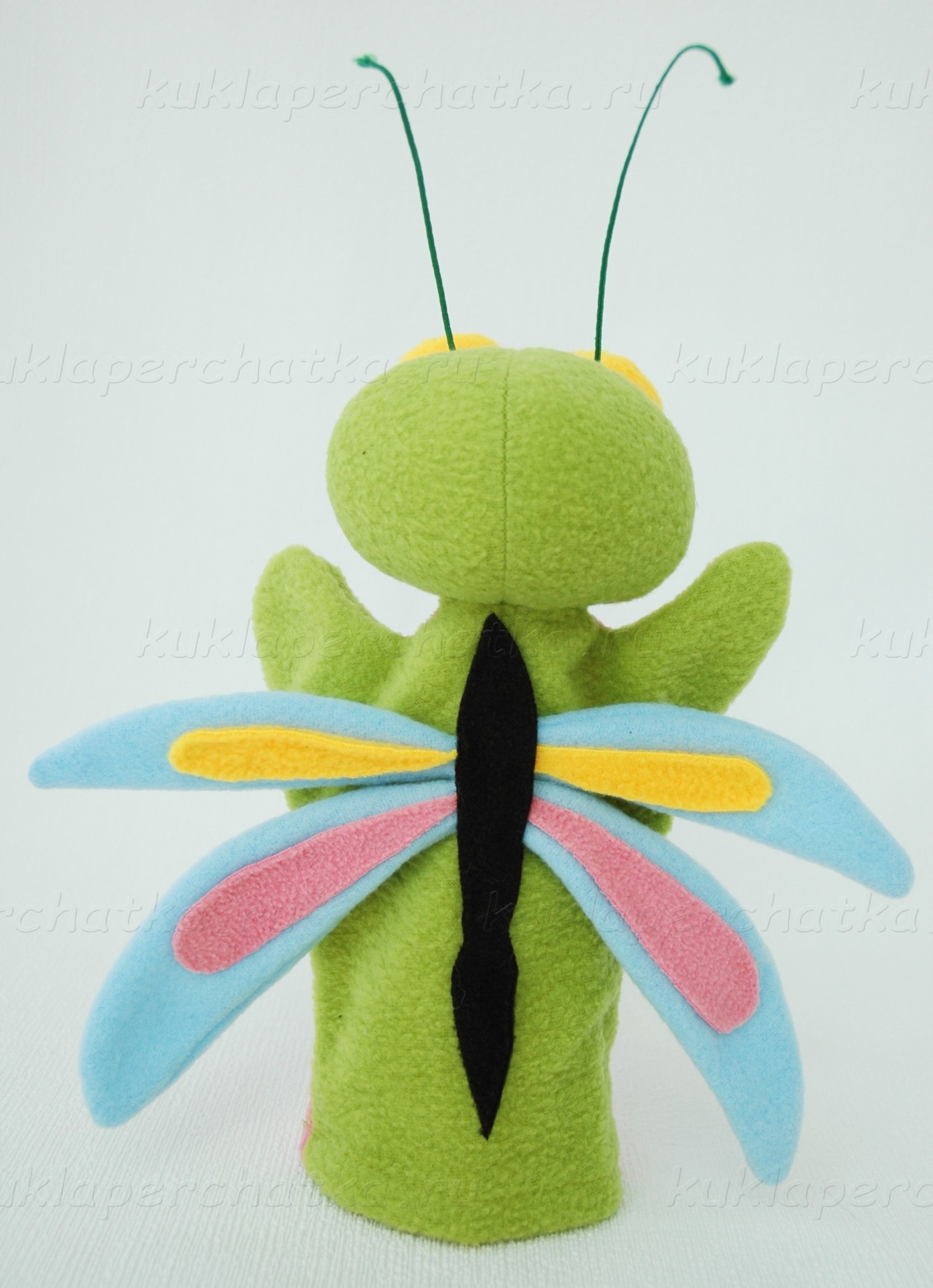 Стрекоза - кукла-перчатка ручной работы . Сшита из флиса. Голова мягко-набивная. Глазки приклеены. Очень мягкая и уютная игрушка, крепко и удобно сидит на руке (не тяжелая - около 100 гр.) . Подходит как для взрослой руки, так и для детской руки. Размер около 25 см. Очень нравится детям.