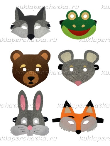 В наборе 6 масок: Лягушка, Мышка, Заяц, Лиса, Волк, Медведь.